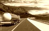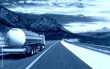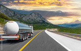 Fuel truck on a picturesque road. A silver tank truck transports fuel.