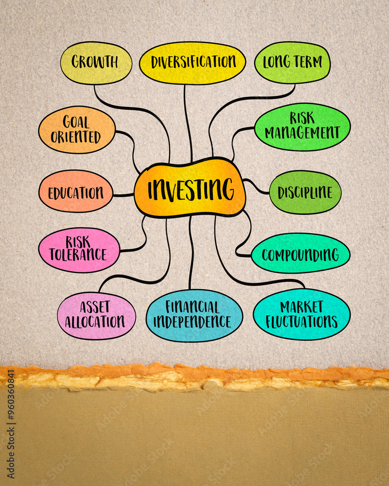 Investing, a strategic approach to building wealth, securing financial independence, and achieving long-term goals, mind map infographics sketch.