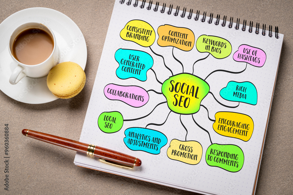 social SEO - optimizing social media content to increase its visibility and discoverability through search engine, infographics mind map sketch.