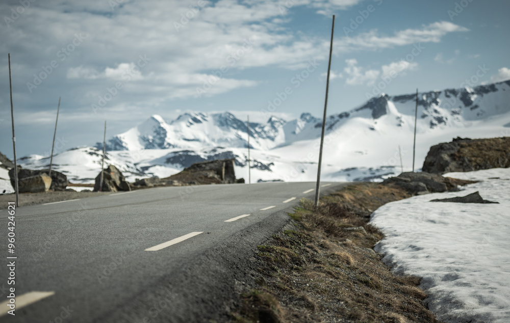 Snow-covered Norwegian Mountains View From a Winding Mountain Road on a Sunny Day in Late Spring