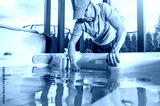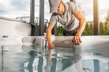 Man Maintaining a Hot Tub Outdoors During a Sunny Afternoon at a Modern Residential Backyard