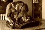 Cane adulto di razza Weimaraner con cucciolo di gatto persiano tartugato