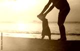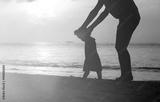 Silhouette of father and daughter learning to walk at sunset