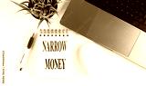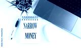 Narrow money concept displayed on a notepad with a laptop, pen, and plant