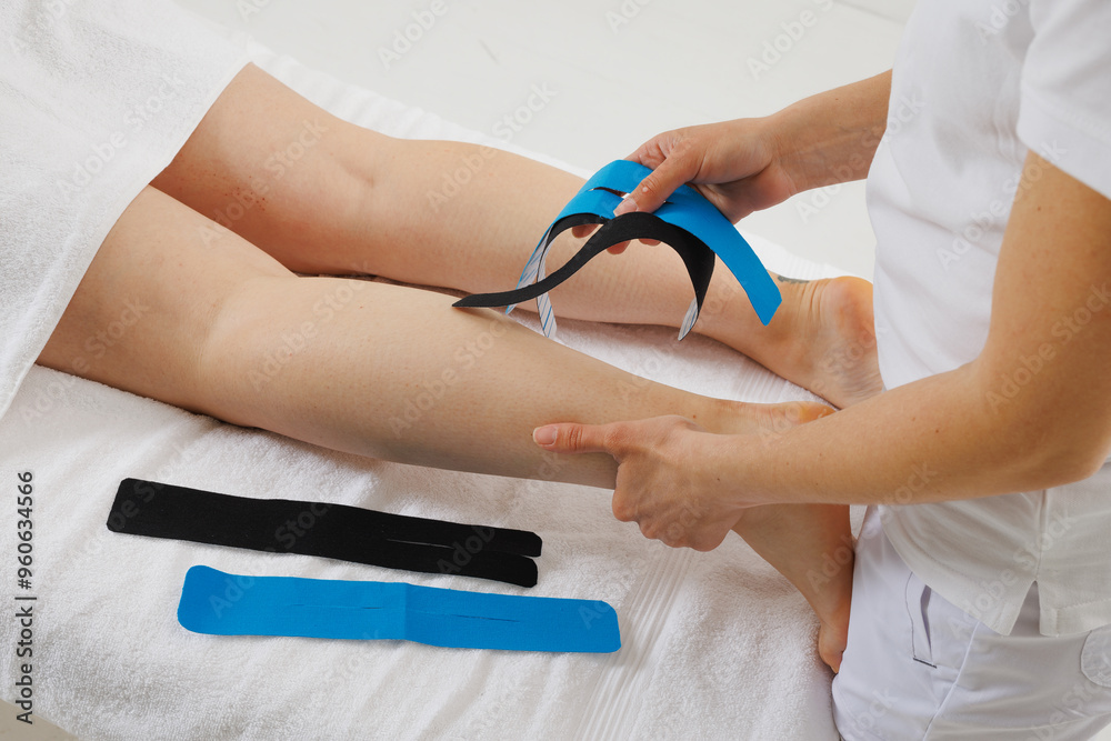 Kinesio taping of the lower extremities to prolong the massage effect close-up