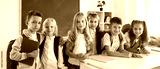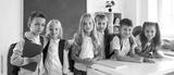 Portrait of a group of happy smiling primary school kids classmates standing in classroom and hugging after a lesson. Schoolchildren looking cheerful at camera. Education and back to school concept.