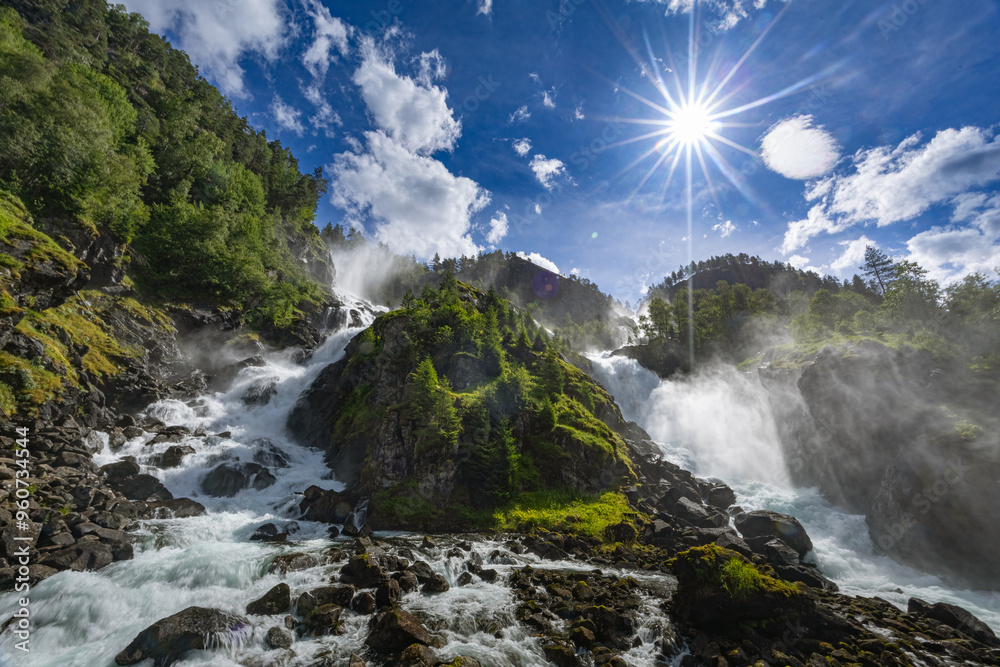 Sun rizing over the Låtefossen Waterfall on a summer day in Norway