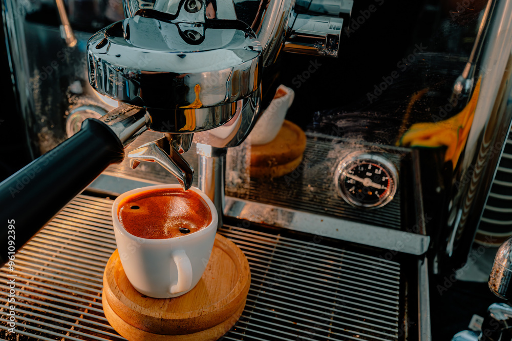 Espresso pouring from coffee machine at cafe,Brewing the espresso coffee from the machine warm tone.