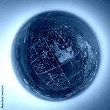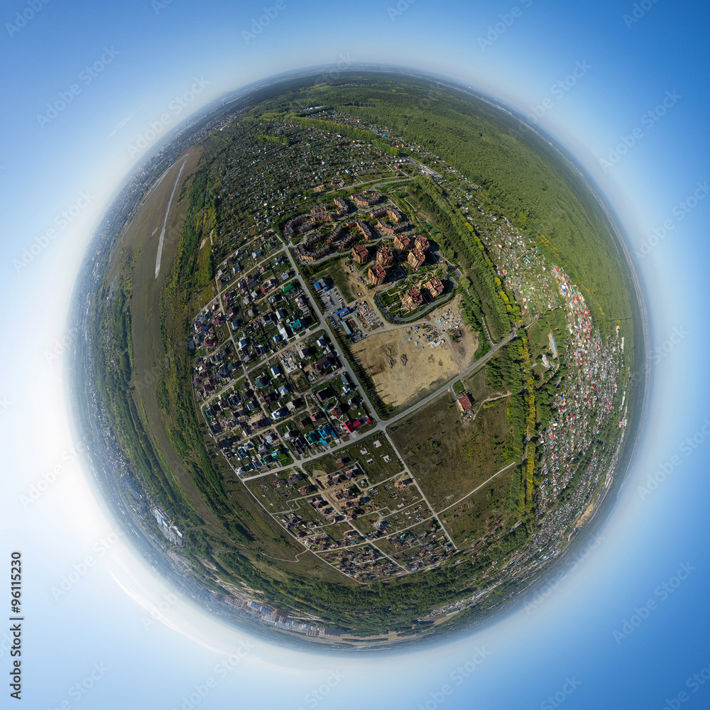 Aerial city view with crossroads, roads, houses, buildings, parks, parking lots, bridges