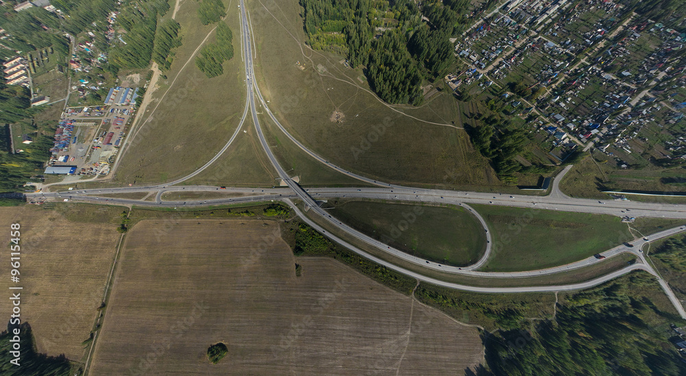 Aerial city view with crossroads, roads, houses, buildings, parks, parking lots, bridges
