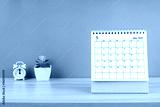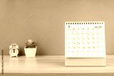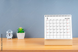 May 2025, Monthly desk calendar for 2025 year on wooden table with grey background.