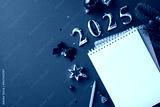 Top view of a 2025 new year concept with golden decorations and a blank notebook. Perfect for illustrating future resolutions and celebrations