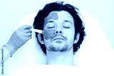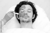 A handsome man receives a rejuvenating mask from a beauty expert. Highlight skin lifting and advanced skincare treatments in your advertising. Perfect for showcasing professional facial care.