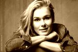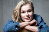 Portrait of a blonde woman with a sweet smile in a denim shirt