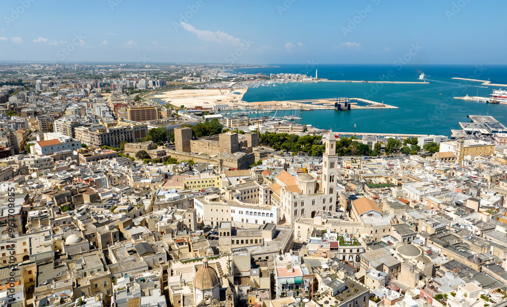 Aerial view of Basilica of Saint Sabinus and the Norman-Swabian castle located in Bari, Puglia, Italy. They are located in the historic center of the city, called Old bari, near the city port.