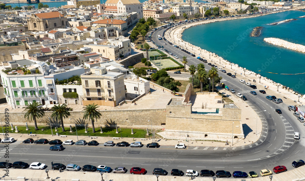Aerial view of the small defense tower of the Fortino Sant' Antonio. The fort is located on the seafront of Bari, in Puglia, Italy. The seafront runs along the entire old city, called Old Bari.