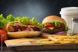 fast food hamburger, hot dog menu with burger, french fries, tom