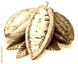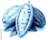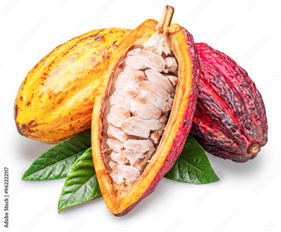 Cocoa fruits or cocoa pods and green leaves isolated on white background. Clipping path.