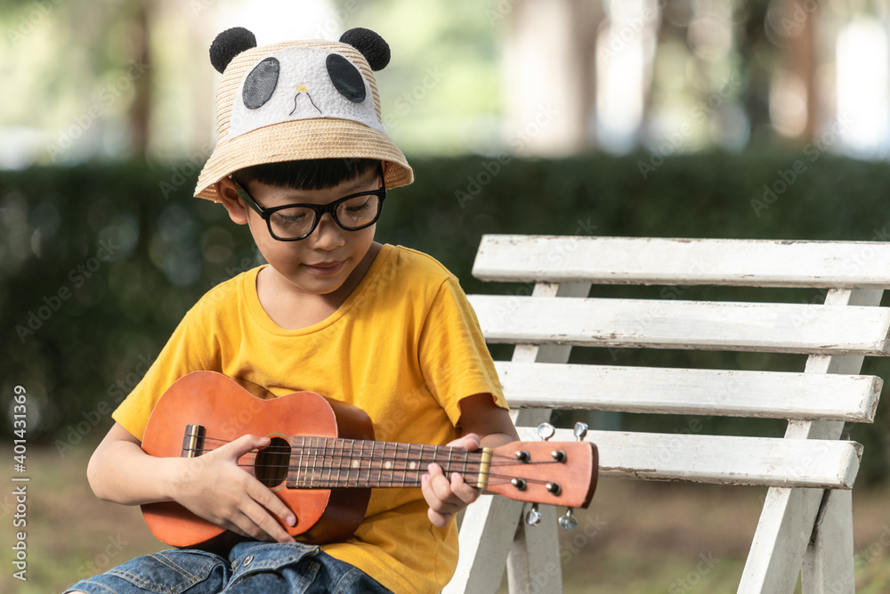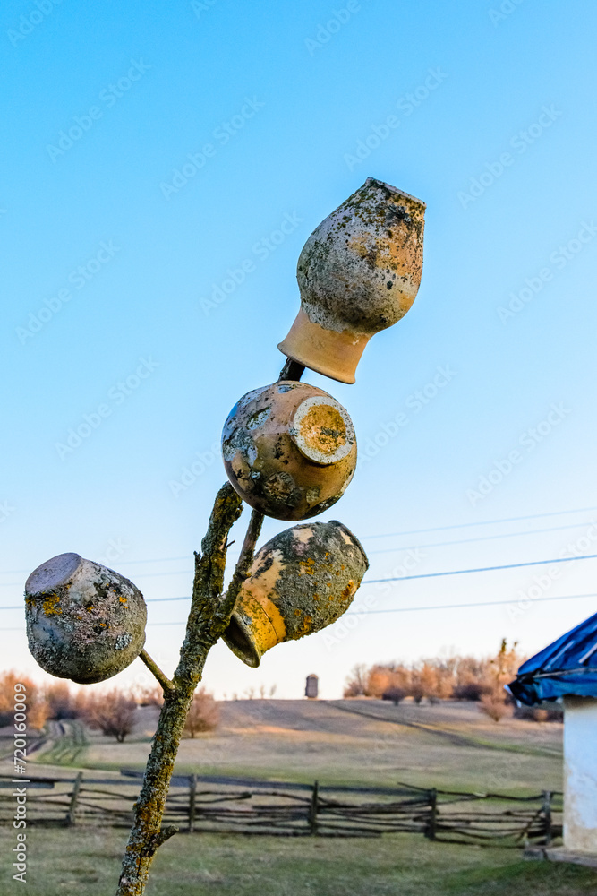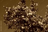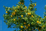 Many of ripe lemon fruits on lemon tree and blue sky at the background. View from above..