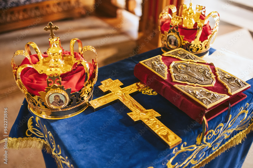 Orthodox church wedding ceremony. Traditional wedding accessories. Bestman hold the crown over bride and groom heads during the vow tradition. Golden crowns and the Holy Bible. Monastery interior.