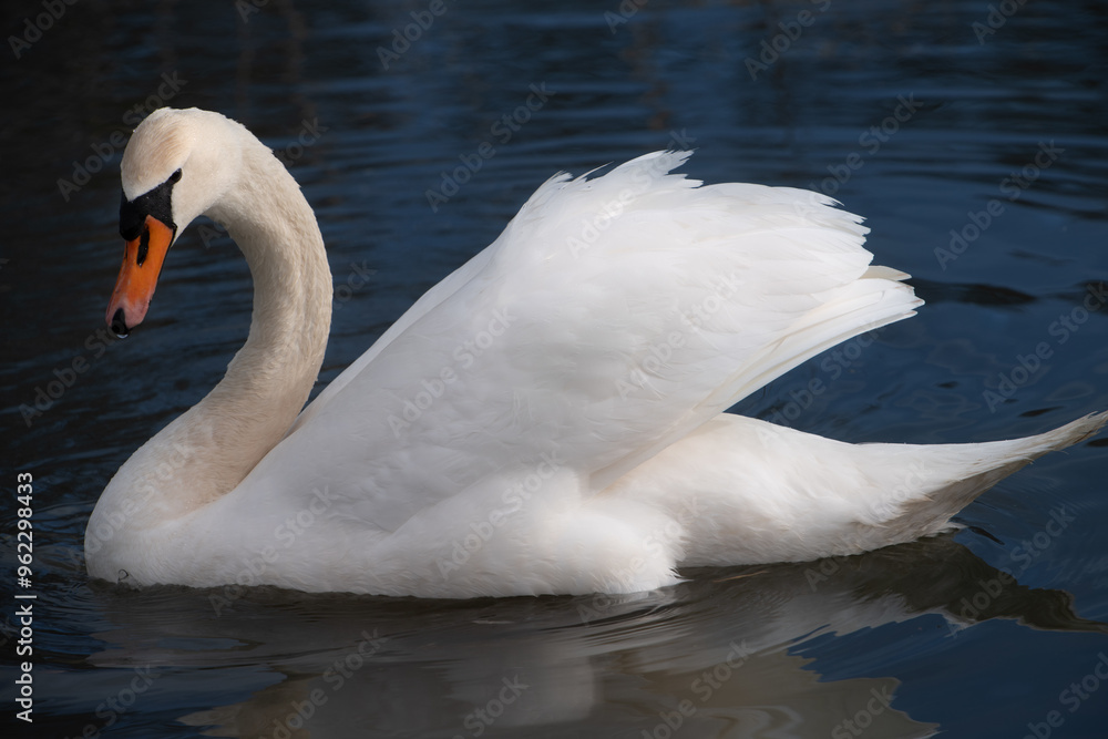 Close-up of a white mute swan swimming on a calm blue water. The animal is photographed from the side.