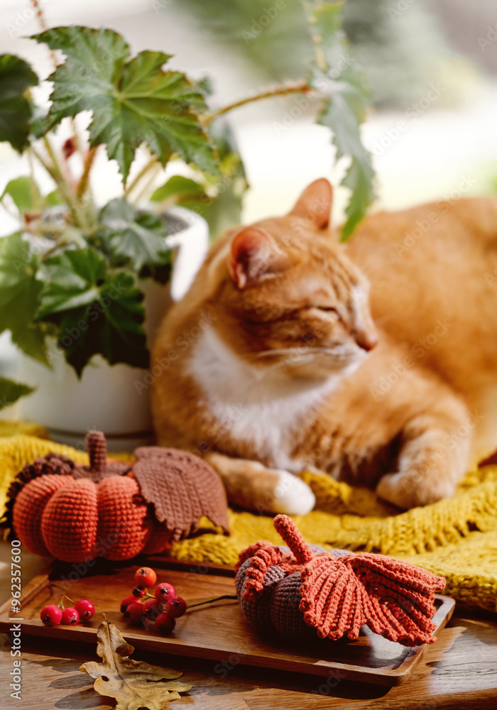cat is sleeping on warm knitted sweater in winter on the windowsill. Cosy home atmosphere with decorative handmade knit pumpkins. Copy space