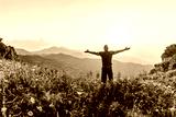 happy man watching amazing highland evening sunset, person delight with nature landscape