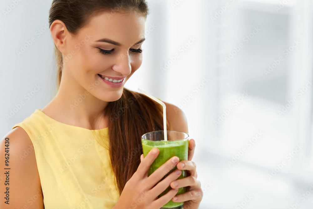 Healthy Food And Eating. Happy Young Woman Drinking Green Detox Vegetable Smoothie. Healthy Lifestyle, Vegetarian Diet And Meal. Drink Juice. Health Care And Beauty Concept.