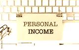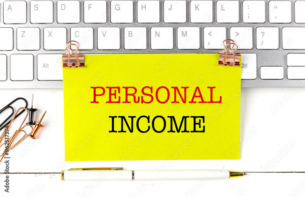 Personal income concept with a yellow note, keyboard, and office supplies on a desk