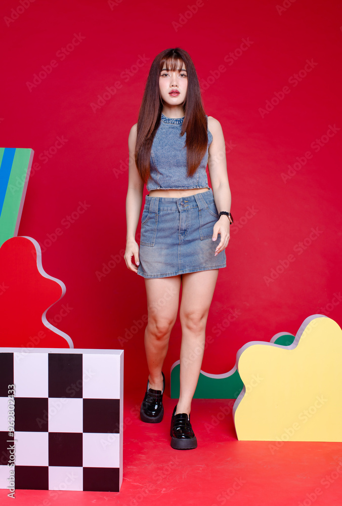 Fashionable photo concept stylish portrait young confident woman model Asian beautiful female wearing trendy denim sleeveless short top and jeans mini skirt, posing in studio on a colorful background.