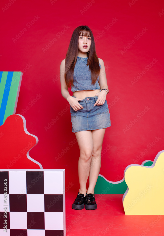 Fashionable photo concept stylish portrait young confident woman model Asian beautiful female wearing trendy denim sleeveless short top and jeans mini skirt, posing in studio on a colorful background.