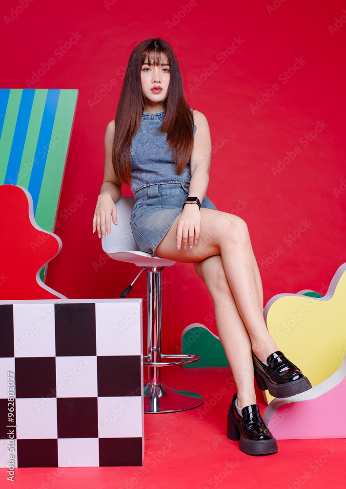 Fashion photo young confident woman Asian model beautiful female wearing trendy denim sleeveless short top and jeans mini skirt posing looking at camera, sitting on tall stool on colorful background.
