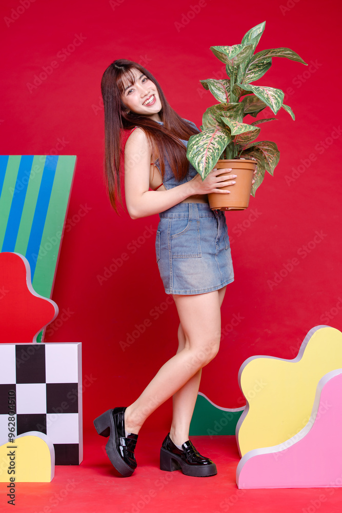 Fashionable photo concept confident woman model Asian beautiful female wearing trendy denim sleeveless short top, jeans mini skirt, standing holding a tree posing in studio on a colorful background.