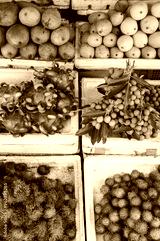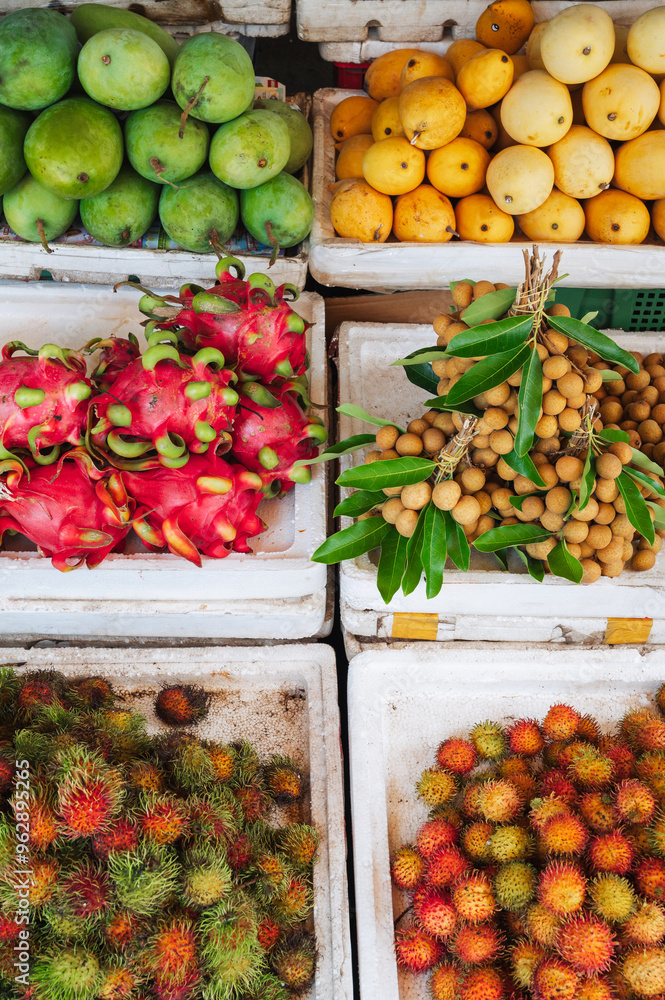 Sale of various fresh fruits at the market in Vietnam.