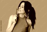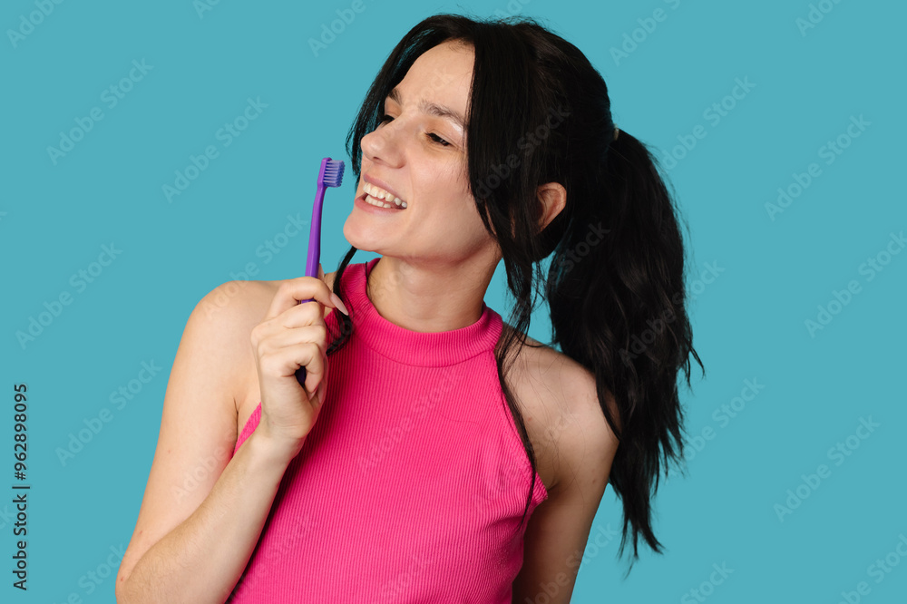 A smiling woman with healthy teeth holds a toothbrush in her hands. A young beautiful girl on a bright background. Oral hygiene.