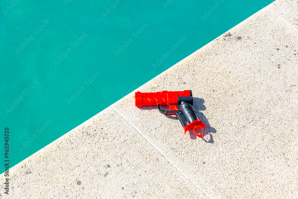 red plastic gun on the edge of a swimming pool in summertime, holidays concept