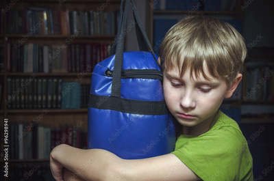 sad little boy hugs a punching bag
