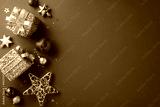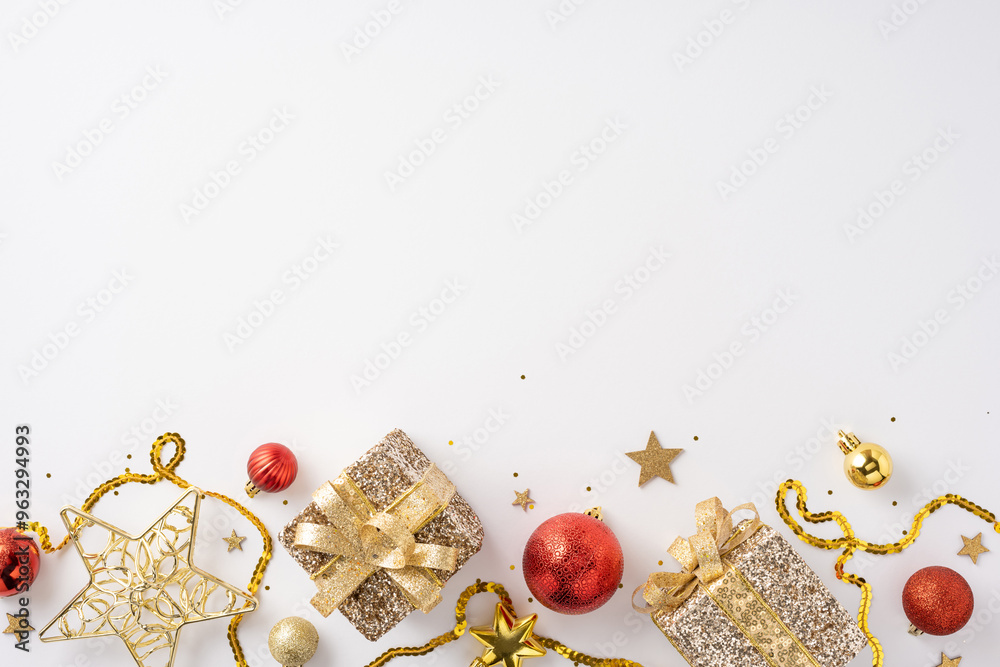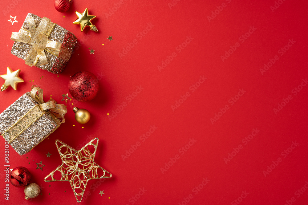 Sparkling golden Christmas presents with festive ornaments on a vibrant red backdrop conveying holiday warmth and joy