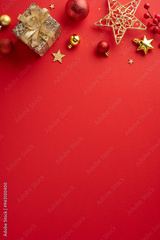 Christmas vertical decorations with golden gift box, ornaments, and stars on a vibrant red background, capturing the festive spirit