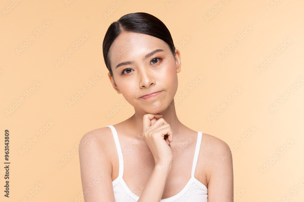 A thoughtful young woman pondering a question with a soft expression against a warm orange background.