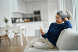 Happy middle aged woman using mobile phone messaging relaxing on couch at home. Smiling older mature lady wearing glasses looking at cellphone doing ecommerce shopping sitting on sofa in living room.