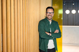 Portrait of positive bank manager with arms crossed and in glasses standing by wooden wall in office