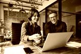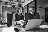 Business team of two executives working together using laptop in office. Happy young business woman manager showing project presentation to mature man client, investor or partner at work meeting.
