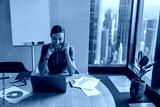 A focused businesswoman on an important call in a modern office, using a laptop to analyze detailed charts
