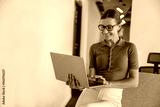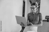 A young woman in glasses is focused on her laptop in a bright office, emphasizing remote work and productivity