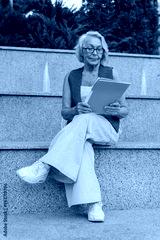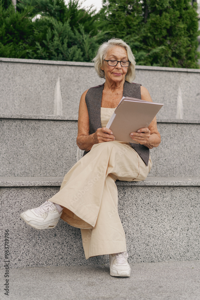 A fashionable elderly woman is savoring a peaceful moment of relaxation while enjoying reading outside in nature