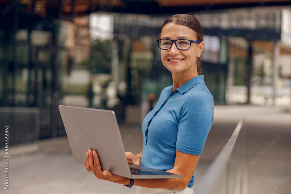 A confident woman wearing a stylish blue shirt is diligently working on her laptop in a contemporary workspace
