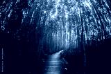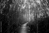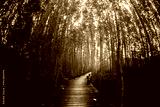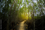 mangrove tree forest wooden pathway glow golden light effect, horizontal comp