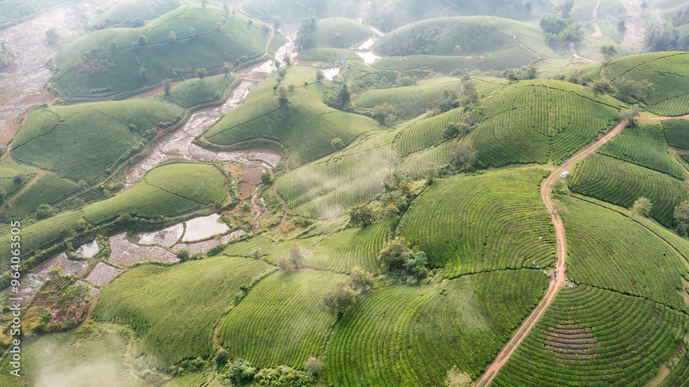 Beautiful aerial view of Long Coc tea hills. Long Coc in Phu Tho Province, Vietnam