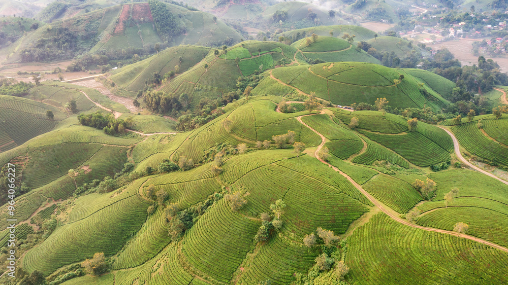 Beautiful aerial view of Long Coc tea hills. Long Coc in Phu Tho Province, Vietnam